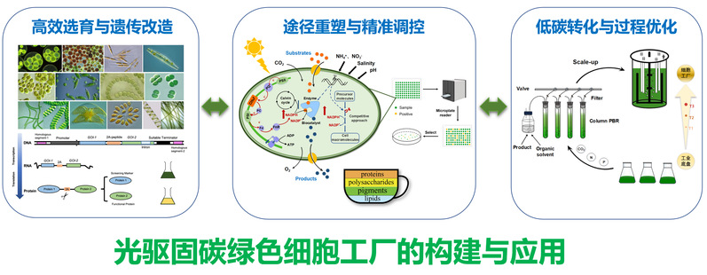 主要针对富含生物活性物质和高效环境修复的微藻优良种质,整合光合微藻底盘与人工半导体材料,定向优化电子传递通道,突破自然光合作用的效率限制,赋予其新功能。重点探索人工光合杂化体的设计与改造、营养与环境因素对生长及代谢影响、光合自养和光暗发酵过程中碳氮磷高效生物转化及优化调控,为生物活性物质生产、环境治理(碳减排和废水处理)与生物质利用、生物饵料与饲料、生物能源的开发提供绿色低碳关键技术。