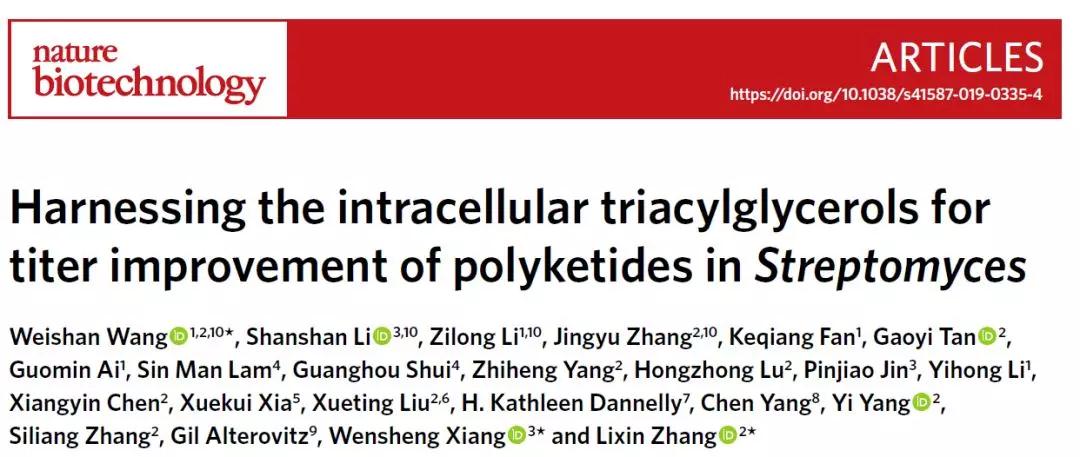 植物保护研究所向文胜研究员,在链霉菌胞内三酰甘油(TAGs)降解机理研究中取得突破性进展,在国际权威学术期刊Nature Biotechnology杂志上以长篇论文(article)形式在线发表题为 “Harnessing the intracellular triacylglycerols for titer improvement of polyketides in Streptomyces” 的文章。