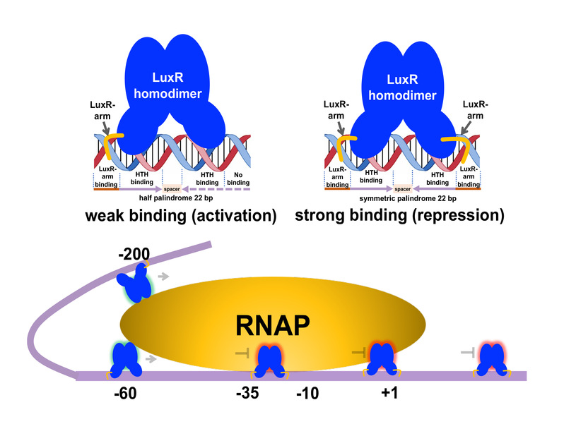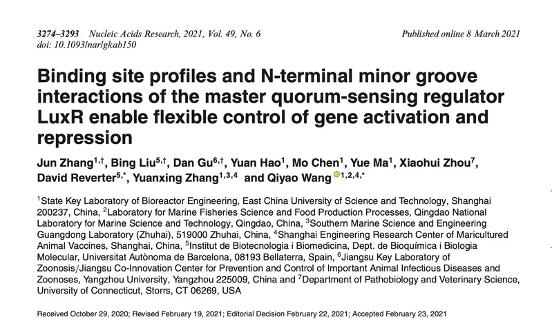 人与人之间可以通过语言、表情和动作进行交流。细菌菌体之间也能进行互相交流通讯,实现细菌的“社会性”行为,实现它们的共同目标,包括生物被膜、生物发光、运动性、营养代谢、毒力调节和环境适应性等。这种菌群交流通讯的机制称为群体感应 (Quorum sensing, QS) 系统。在海洋弧菌中存在复杂的群体感应系统,介导进行细菌种内和种间、细菌-藻类、细菌-动物宿主等多种信号交流机制,最终通过TetR家族的中枢调控元件LuxR蛋白同步控制下游多达600多个QS基因的表达,产生菌群行为。人们对LuxR蛋白同时调控诸多基因表达的机制一直不清楚。4月6日,国际知名的生化与分子生物学学术期刊Nucleic Acids Research发表了国产自拍