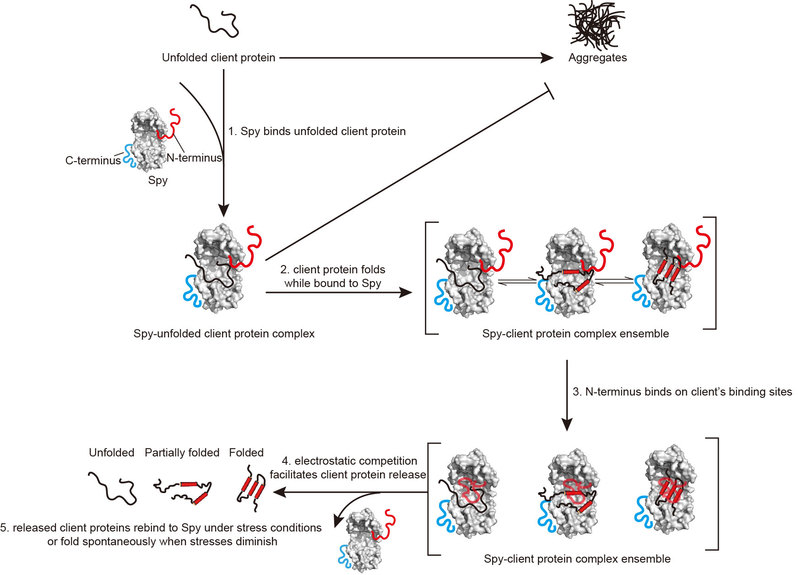 蛋白质错误折叠与聚集沉淀与多种人类疾病密切相关。分子伴侣是帮助蛋白正确折叠、抑制蛋白聚集沉淀、介导错误折叠蛋白降解的重要因子。掌握分子伴侣的作用机制,对于以分子伴侣为基础的新型疾病治疗手段的开发与优化具有至关重要的作用。分子伴侣Spy是一种较为原始的折叠型分子伴侣。国产自拍