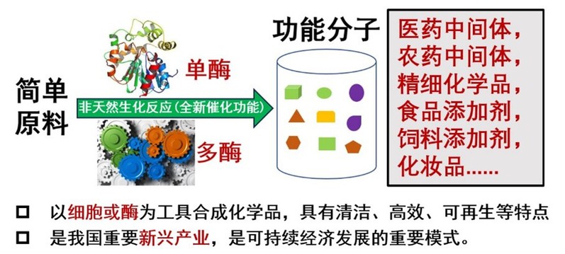 与人类所能用的化学反应相比,生物催化的反应类型明显不足(低于100种),远远不能满足绿色生物制造产业发展的需求。主要因为酶一般只能催化天然反应、天然底物(酶催化的特异性),导致酶催化的工具箱匮乏,这也是生物制造领域目前面临的主要瓶颈。进行酶催化的非天然化学反应研究来实现“一酶多用”(赋予天然酶没有的多种全新催化功能),让酶能够像化学催化剂一样催化多种不同的反应类型,可以大大提高酶的实际应用价值,促进其在医药、农药和精细化学品等生产中的应用以及生物制造产业发展。