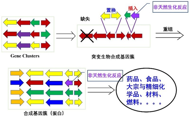 通过基因缺失、替换、插入新基因簇(包括编码非天然反应基因)等等构筑人工生物合成途经,实现①缩短天然代谢途径、②生长与生产的解耦、③非天然药物等功能分子的合成等等,最终实现目标分子工业上的高效量产。