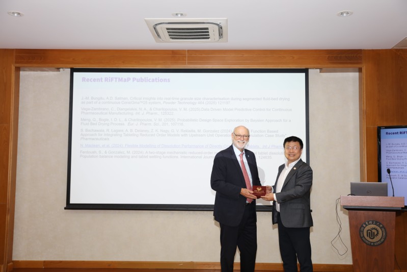 互动环节中,师生围绕制药过程数字化转型、智能模型工程化应用等热点议题与Litster院士展开深度研讨。张立新教授代表实验室向 Litster 院士颁发了 “俊棠论坛” 纪念奖牌,致谢其在交叉学科研究领域的前瞻性分享。