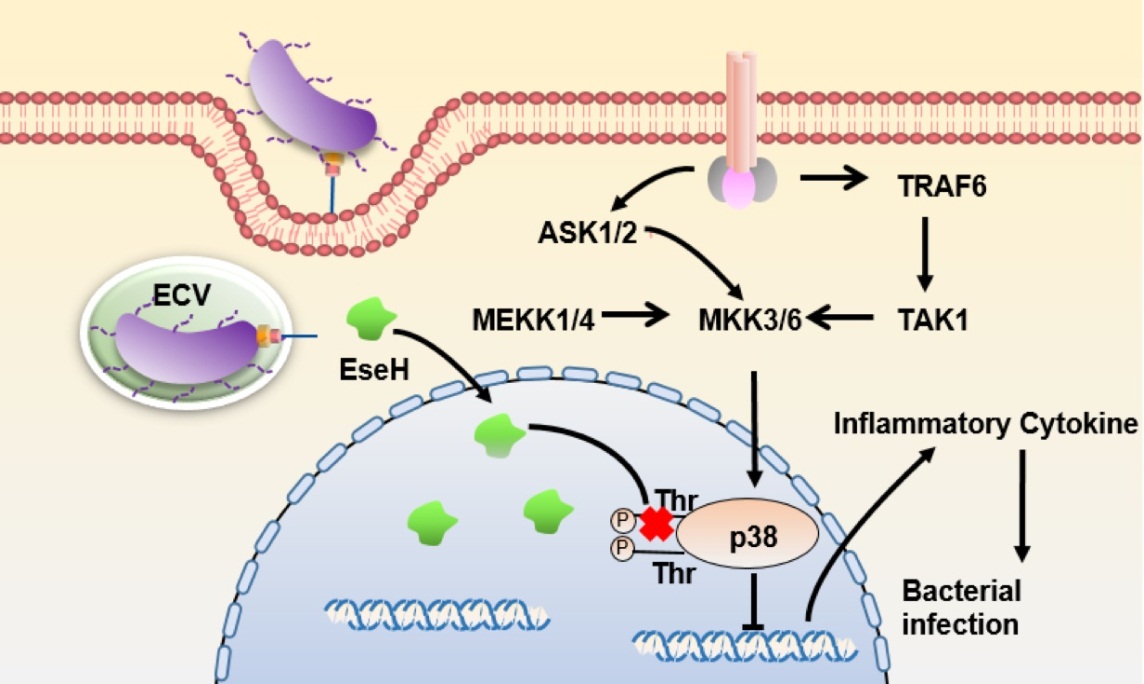研究发现,杀鱼爱德华氏菌T3SS效应物EseH具有典型的磷酸苏氨酸裂合酶特性,并依赖III型分泌系统转运到宿主细胞核中。该效应蛋白能够有效抑制MAPK信号通路,介导下游细胞因子的转录和表达。该研究解析了杀鱼爱德华氏菌的EseH效应蛋白通过靶向MAPK信号通路,促进系统性感染的发生。该研究工作为开发针对该病原的新型疫苗和药物提供了重要线索。