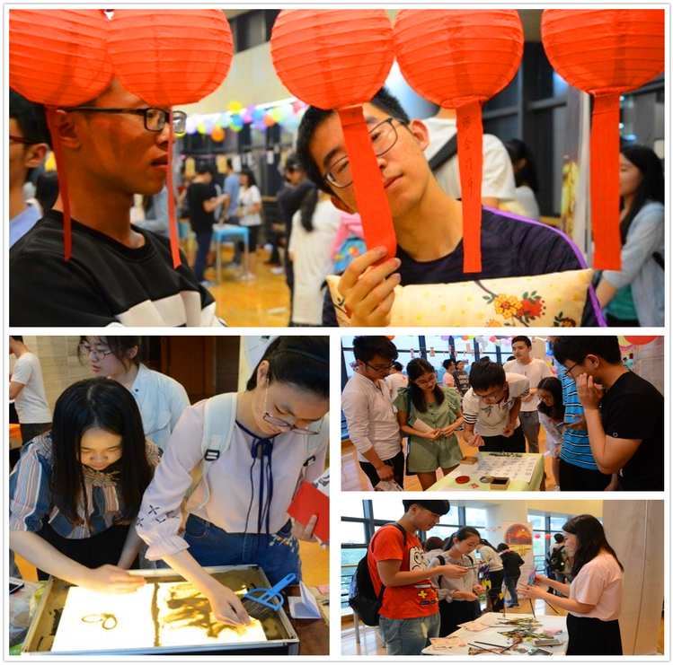 本次博览会为热爱传统文化的师生提供了一个体验非物质文化遗产的近距离机会,精心设置了八个互动展台。“魅音戏曲”环节邀请学子们动手为脸谱上妆,并学唱经典京剧选段。“多彩二十四节气”环节则通过节气诗歌朗诵、节气日历计算小测试等带领大家了解我国古代劳动人民智慧的结晶。“迷幻花灯”介绍了灯彩之美,以趣摘灯谜、提灯寻花等小游戏鼓励大家主动担起传播非遗的责任。“落花沙画”展示了我国独特的沙画艺术,现场师生以沙作画,你画我猜,其乐无穷。“神奇皮影”邀请大家近距离观赏皮影戏,并参与皮影戏人的搭建和幕后的自导自演。“大写篆刻”通过识别反刻字,亲手制作橡皮章,使得参与者对这中国书法的魅力有了更为深切的感受。“天作剪纸”带领大家欣赏了巧夺天工、栩栩如生的经典剪纸图案,现场师生们也尝试着用剪纸去表现自己天马行空的创意。“活字印刷”则指导大家用42个印刷字的模板印出一首完整的诗,真切体验了古老的印刷术。