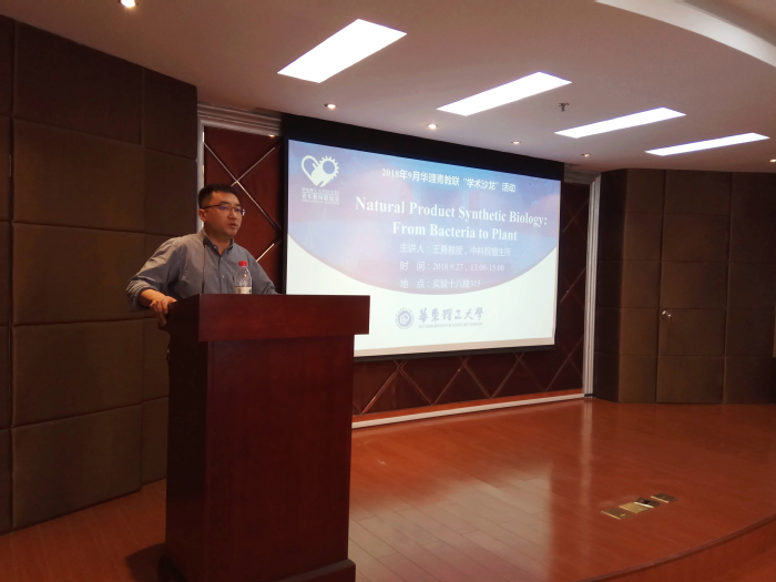 植物生理研究所的王勇教授,报告的主题是“天然产物的合成生物学:从微生物到植物”。报告吸引了多位青年教师及在读博士生前来参会。
