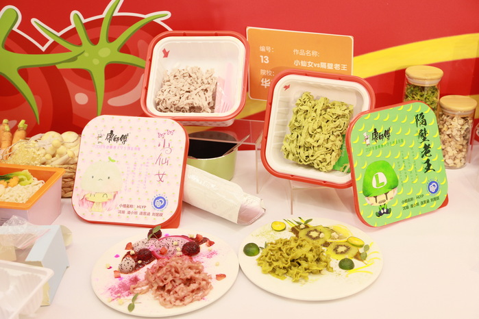 沈瑜团队针对干拌面倒水不便的问题设计了一款带有软塞的嵌套式双层面碗,还利用温变油墨对面盖纸作了改进,又在传统方便面的基础上制作了紫薯和菠菜非油炸面饼;吴安迪团队针对营养搭配、汤汁处理及面饼改良等方面进行了创意设计。这两组作品在决赛现场都引发了评委们的极大兴趣,也受到一致好评。