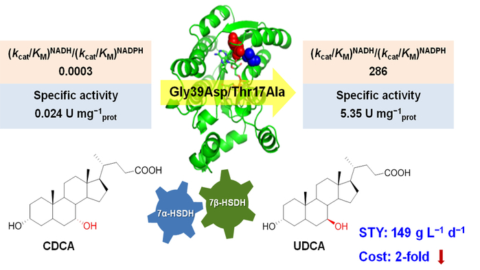 生物反应器工程国家重点实验室及上海生物制造技术协同创新中心许建和课题组,在改变羟甾脱氢酶辅酶偏好性方面研究取得新突破。美国化学会催化杂志ACS Catalysis以“Switching cofactor dependence of 7β-Hydroxysteroid dehydrogenase for cost-effective production of ursodeoxycholic acid”为题报道了这一最新研究成果(DOI:10.1021/acscatal.8b03561)。