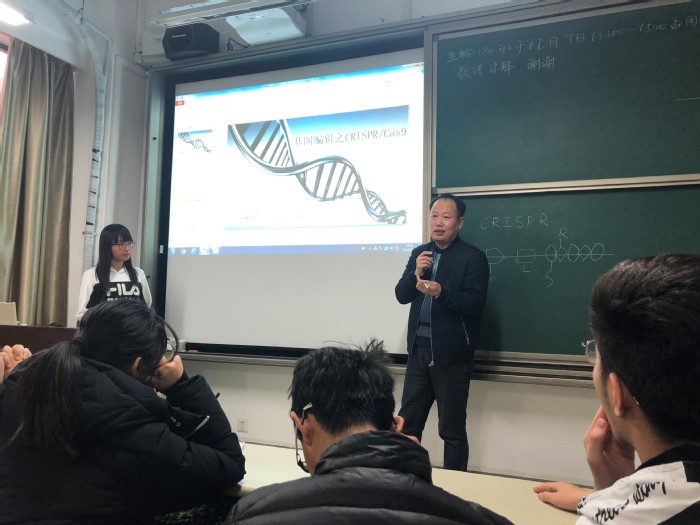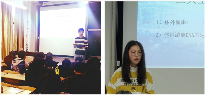 班会首先进行了生命科学调查竞赛答辩,答辩总共分成6个竞赛小组进行,同学们利用课外时间,调研收集了生命科学领域近10年来国际前沿领域所取得的重大科学进展,评选出自己认为最具影响力的科学成果,以PPT形式展示该成果的研究发现历程、所阐明的科学问题和展现的科学价值。有4组同学不约而同选择了当下广泛关注的基因编辑技术,着重介绍了基因编辑技术中的CRISPR/cas9技术,剩余的两个小组介绍的则是诱导性多能干细胞IPSC领域的科学进展。该活动的主要目的是为了树立同学们对今后专业学习的早期认识和兴趣,并锻炼和培养团队合作及独立思考的能力。答辩尾声,马悦对各个小组的讲演一一进行了点评,分享了他所掌握的专业知识,并根据各组的讲演与展示内容,提出了一些有趣却非常尖锐的问题,启发了同学们在发现科学和专业之美之外的人文思考。