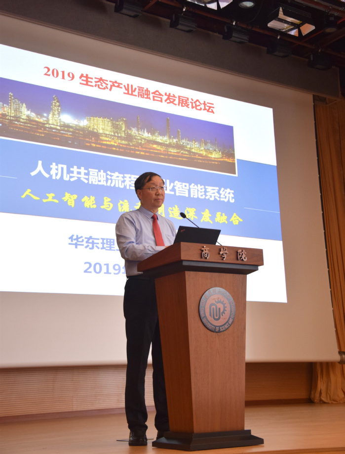 随后,生态产业融合发展论坛正式开始。首先是钱锋院士做了题为“人机共融流程工业智能系统——人工智能与流程制造深度融合”的专题报告。报告从人工智能赋能新时代,国内外人工智能技术发展进程和我国人工智能发展的政策环境出发,从流程制造高质量转型发展和人工智能赋能制造业两个角度阐述了二者互相融合的必要性。他结合具体应用场景案例分析,重点探讨了以“智能制造+绿色制造—>高端制造”为目标的智能优化制造愿景,并围绕人工智能与流程制造深度融合实现智能优化制造凝练了相关工程科学问题。报告以问题为导向,以需求驱动、应用导向为目标,提出了当前流程工业制造系统智能化的主要研究内容和关键技术,并给出了工业应用示例。