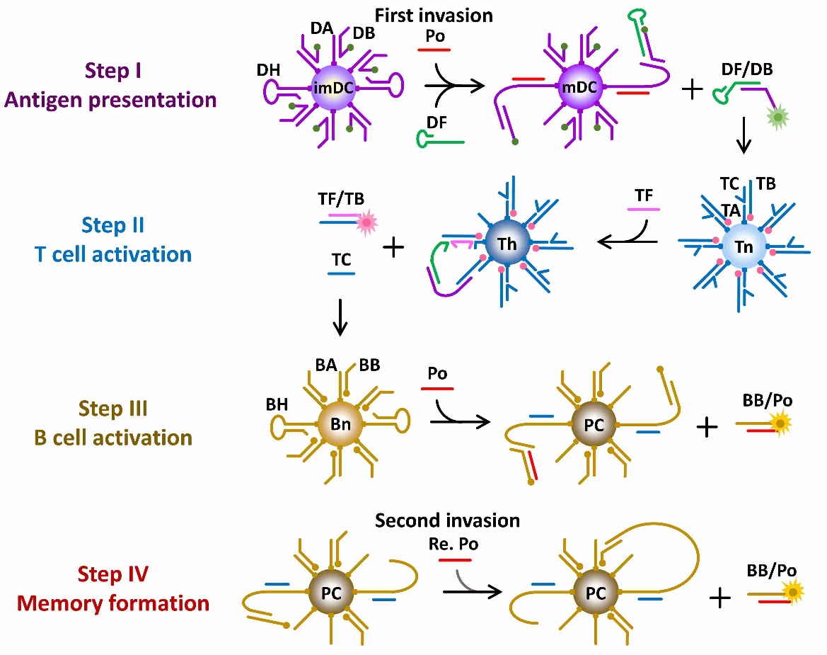 生物反应器工程国家重点实验室叶邦策教授课题组通过模块化设计DNA分子机器,开发了一种多DNA机器交互网络系统,成功模拟了脊椎动物获得性免疫系统中细胞与细胞间通讯对病原体的识别,清除以及记忆。通过三种DNA分子机器分别模拟关键免疫细胞:树突状细胞(DC)、T细胞和B细胞,生动地展示了病原体侵袭过程中DC细胞,T淋巴细胞和B淋巴细胞的连续激活、抗体分泌、记忆形成和快速高效的二次应答。