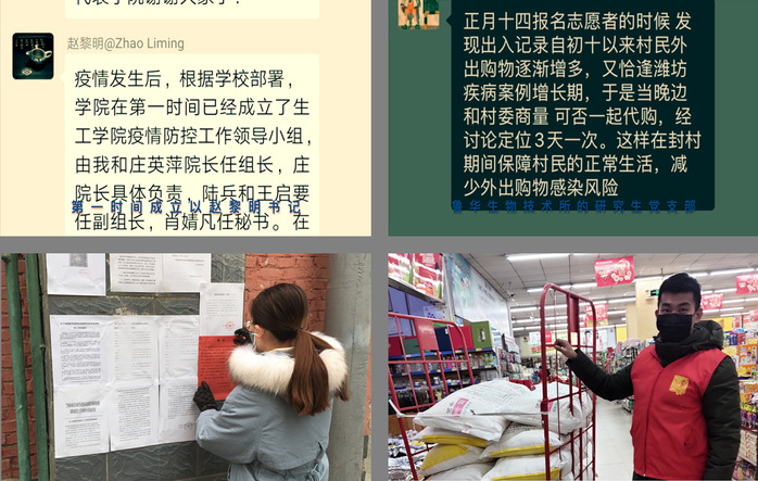 部署,第一时间成立以赵黎明书记、庄英萍院长为组长的疫情防控小组。陆兵副书记亲自书写名为《打赢抗击病毒战之我见》的文章,与全院党员同志交流。鲁华生物技术所的研究生党支部在线上召开组织生活会;组织并动员支部成员捐款、捐物;拍摄疫情防控宣传视频;在家乡参加志愿者服务,默默奉献,如被称为“全村希望”的王明睿同志、与居委会一起共同张贴宣传标语的邓思敬同志等。大家始终贯彻“把初心落在行动上、把使命担在肩膀上”,积极为疫情抗击奉献自己的一份力量。