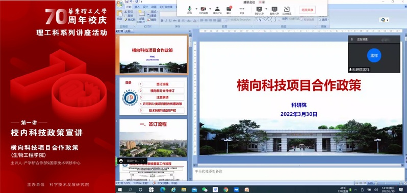 举办横向科技项目合作政策宣讲,作为70周年校庆理工科系列讲座活动之一,邀请了校科研院孟祥、全若兰、房国辰、黄玥等老师,为国产自拍