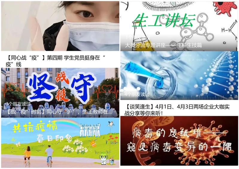 特色、增进师生联系、引领网络思潮为宗旨。将校院活动、信息预告、学术交流、时事热点等内容进行实时报道,开设【科普科创】、【同心战“疫”】、【战“疫”时刻】、【共抗疫情、春日印象】系列。既以百花齐放的活动传递院校温情,又生动展现了疫情期间生工学子“只要疫情不退,志愿服务不停”的真情奉献,和冲锋在前的精神面貌,塑造了国产自拍