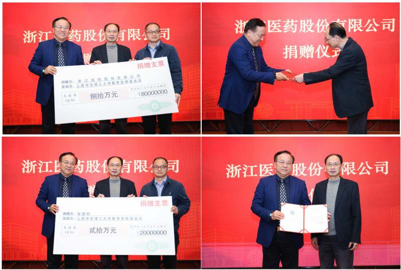 领导以及师生代表的共同见证下,李建伟、叶邦策代表受赠方接受了浙江医药股份有限公司和张国钧校友个人的捐赠,李建伟为浙江医药股份有限公司和张国钧校友分别颁发了捐赠证书。