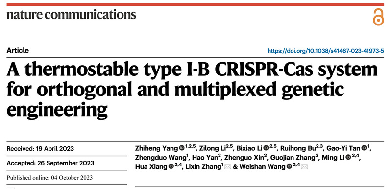 微生物研究所王为善研究员合作在Nature旗下期刊《Nature Communications》上发表题为“A thermostable type I-B CRISPR-Cas system for orthogonal and multiplexed genetic engineering”的研究论文。这项研究开发了一种高度热稳定的Type I-B CRISPR-Cas系统,为高温菌的基因工程和转录调控提供了全新的工具。