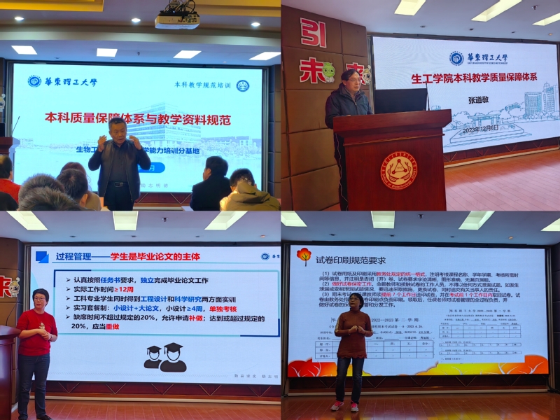 第四届本科教育教学督导专家张惠展、张道敬,应用生物学系主任吴海珍,食品科学与工程系副主任曹旭妮四位老师就课堂教学、教学质量保障体系、毕业论文规范和试卷规范进行了专项培训。