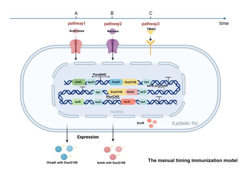 iGEM团队以“Poros Vaccine— A Vaccine Trojan Horse for Programmed Sequential Immunization in Fish Intestine”为主题,在老师指导下,构建了Edwardsiella piscicida细菌毒力因子筛选与蛋白互作的机器学习模型,并使用转座子插入技术降低了该菌种的毒性,构建了能够长期在大菱鲆体内长期定植的底盘疫苗株。随后,团队对底盘疫苗株进行相关基因工程改造,使疫苗株响应环境刺激并依次产生分泌抗原,进而使宿主成为抗原工厂,时序性产生针对不同病原体的特异性免疫,实现“一剂防多病”的自动免疫预防接种效力。此外,团队就疫苗的生物学效价搭建了三个数学模型并有效分析了其浓度响应区间、间隔时间等关键问题,为疫苗的安全性与可行性评估提供了理论支持。