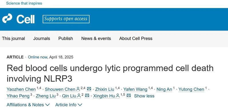 刘琴教授团队联合空军军医大学附属西京医院胡兴斌副教授团队,揭示了一种红细胞程序性死亡的新机制。北京时间4月18日,国际期刊Cell(《细胞》)以“Red blood cells undergo lytic programmed cell death involving NLRP3”为题,发表了这一研究成果。