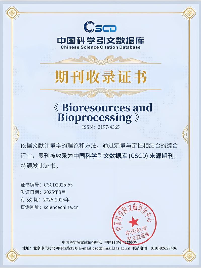 主办的学术期刊《生物资源与生物加工(英文)》(Bioresources and Bioprocessing,简称BIOB)连续获得两项重要荣誉,标志着期刊在国内外学术影响力方面取得新的突破。